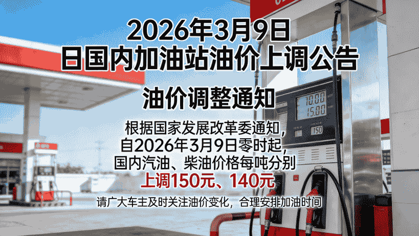 2026年3月9日,记者从多家行业机构获悉,当日24时我国将正式上调汽柴油零售限价,其中每吨汽油上调695元、柴油上调670元,折合每升92号汽油上调0.53元、95号汽油上调0.56元。这是2026年以来第五次成品油调价,也是第四次上调,同时创下年内单次调价最大幅度。
